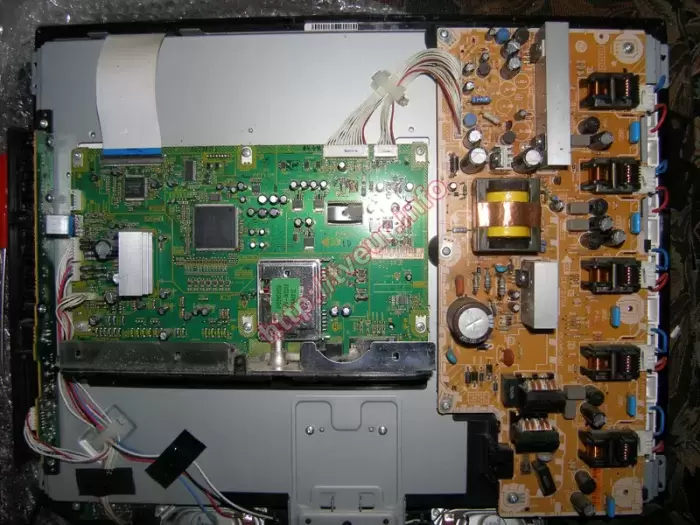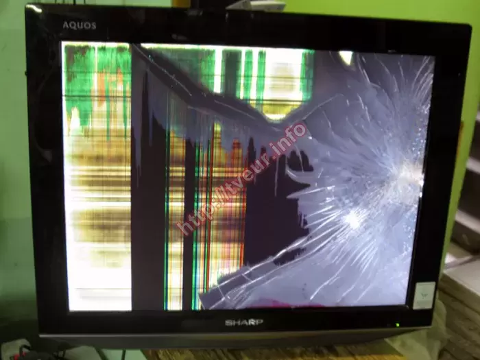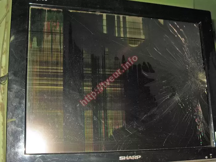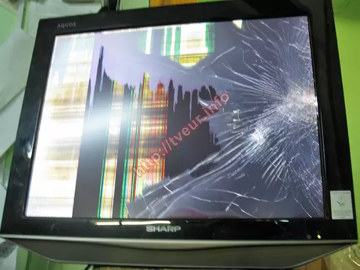 Когда на экране любого современного телевизора появляются трещины, это говорит о том, что ремонт будет сложным и дорогостоящим, поскольку гарантированно потребуется замена матрицы телевизора, выполнить которую можно в стационарных условиях сервисного центра, где для этих целей предусмотрено специальное оборудование. В данном случае к нам поступил 20-дюймовый LCD телевизор Японского производства - SHARP LC-20S5E-BK, у которого очень сильно разбит экран. Эта модель наделена форматом экрана 4:3, разрешением 640 x 480 пикселей, яркостью 430 кд/м2 и контрастностью 600: 1. Осмотрев телевизор стало понятно, что удар был возле правой боковой рамки, более того, он был настолько сильным, что от места удара, практически до середины экрана многочисленные трещины на светлом фоне, чем-то напоминающие потрескавшийся лед. Остальная часть экрана залита разноцветными пятнами и горизонтальными, вертикальными полосами. Так, возле верхней рамки пятна зеленого цвета, ближе к середине - светло коричневого. Нижний левый угол залит белым цветом (отлично видно на фото № 1 и 2). Чтобы выполнить замену матрицы телевизора, его необходимо полностью разобрать, аккуратно снять разбитую и только потом установить новую. Это сложный ремонт, но результативный. После замены нового экрана, сделаны все необходимые настройки. Беречь от ударов, вибраций и толчков!