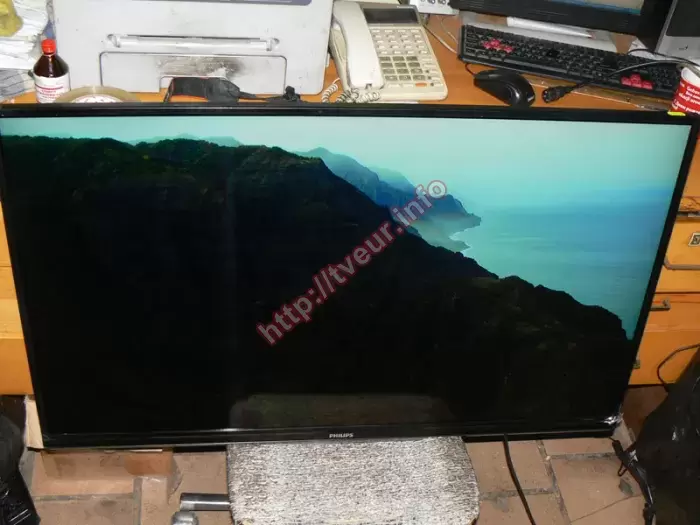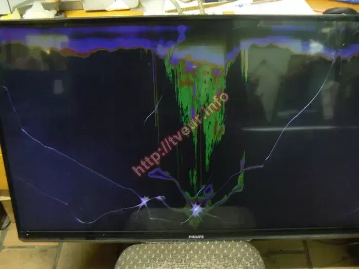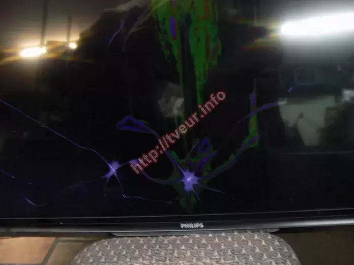 В сервисный центр поступил 3 D телевизор Philips 42PFL6057T, собранный в Венгрии, у которого экран с механическими повреждениями. Как объяснил заказчик по телевизору нечаянно ударили дети во время игр, как результат он пришел в негодность. В данном случае возможна исключительно замена экрана на телевизоре Philips, которая будет дорогой. Это связано с тем, что данная модель с большим 42-дюймовым экраном, наделена самыми современными технологиями, такими как, Smart TV и Wi-Fi. Кроме того, сам по себе ремонт по замене панели относится к разряду сложных. После осмотра телевизора стало понятно, что удара было два, более сильный чуть выше логотипа, второй, чуть слабее - левее. В районе ударов светящиеся пятна, в разные стороны от которых трещины. Визуально этот разбитый экран напоминает «северное сияние», поскольку всей верхней рамки образовалось пятно синего цвета. Посередине оно переходит в зеленый цвет с синими небольшими пятнами. И распространяется аж до места удара, вокруг которого пятно такого же цвета (отлично видно на фото № 1). Чтобы замена экрана на телевизоре Philips стала возможной, во-первых необходимо купить новую панель, учитывая модель, диагональ и другие факторы, во-вторых, снять разбитую деталь так, чтобы не повредить сам телевизор. Только после этого может быть установлена новая матрица и сделаны последующие настройки. В данном случае ремонт по замене был с положительным результатом. На него и на новую деталь выдана гарантия.