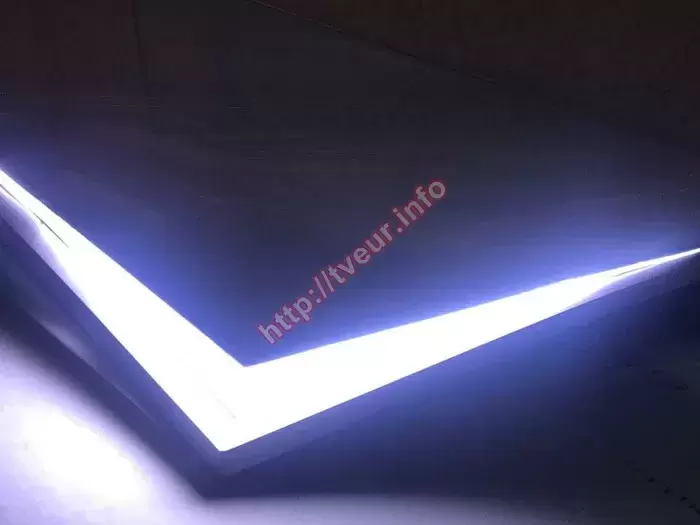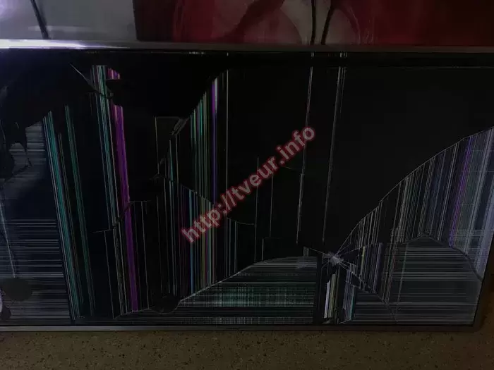 При первоначальном осмотре стало понятно, что экран разбит достаточно сильно, сломана и оторвана рамка, от крепежей оторвана часть матрицы, поэтому в этом месте ярко светит подсветка. Весь экран в многочисленных механических дефектах, правее логотипа Самсунг, недалеко от нижней рамки появился светящийся скол. От этого места в разные стороны трещины, между которыми вертикальные и горизонтальные разноцветные линии с разной длиной и шириной. Большого размера пятно серого цвета образовалось в верхнем левом углу, оно распространяется практически до нижнего угла. Как показывает практика, это произошло отслоение матрицы. Немного правее видны горизонтальные светлые полосы, а также круглое серое пятно. В данной ситуации необходимо выполнить не только замену ЖК экрана телевизора Самсунг, но и поменять рамку в сборе с креплением.