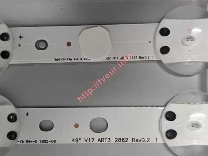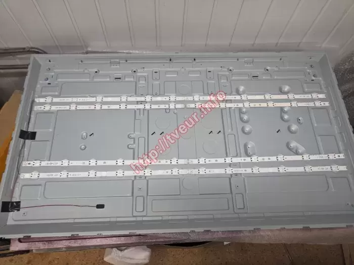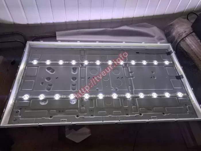 При первом включении телевизора в сервисной мастерской стало заметно, что вместо нормального белого фона экран отдает выраженным синим свечением, а изображение выглядит чрезмерно темным и едва различимым. Определить, каким образом будет производиться ремонт подсветки на телевизоре, возможно только после проведения полной технической диагностики. В процессе разборки устройства установлено, что в данной модели подсветка состоит из двух планок, каждая из которых оснащена 12 светодиодами. Вместо стандартного белого свечения диоды испускают синий свет, что указывает на серьезное отклонение в работе системы подсветки. Проблема оказалась в выгорании люминофора - специального вещества, наносящегося на светодиоды для преобразования исходного ультрафиолетового или синего света в белый. Причиной выгорания люминофора могли стать длительная эксплуатация, перегрев или электрические перегрузки. В результате спектр свечения сместился, и подсветка перестала выполнять свою функцию корректно. Учитывая степень износа, частичный ремонт здесь невозможен. Единственным разумным решением в данном случае является полная замена светодиодных планок, то есть замена всего комплекта подсветки.