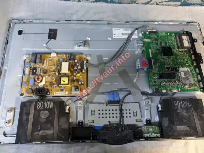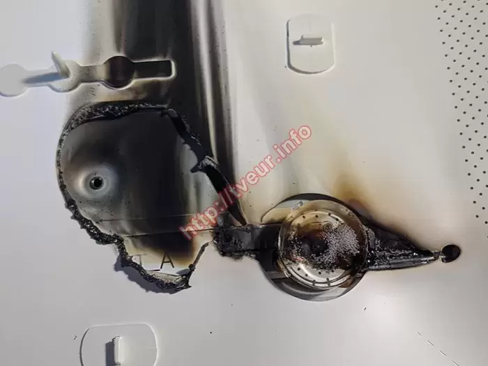После разборки телевизора выяснили, что в его состав входят такие модули, как материнская плата (Main Board) PCB:EAX65610906(1.1), матрица NC320DUN, модуль питания PCB:EAX65391401(3.0), ТВ тюнер EBL61400501, шлейф EAD62572203, а также 10-Ваттные динамики EAB62972202. В данной модели реализована подсветка, состоящая из трех планок, на каждой из которых установлено по шесть светодиодов. В ходе оглупленной диагностики выяснили, что ремонт светодиодной подсветки телевизора LG неизбежен, поскольку проблема именно в ней. Неисправность выражена максимально сильно, появилась грязь от нагаров, очень сильно сильно прогорел лист-отражатель подсветки, на котором образовалась дырка и пятно черного цвета. С правой стороны одна из планок сгорела «в уголь» вместе со светодиодом, кроме того, начал прогорать провод питания планок подсветки. Этим и вызвано появление запаха горелого.