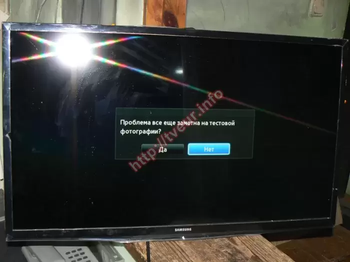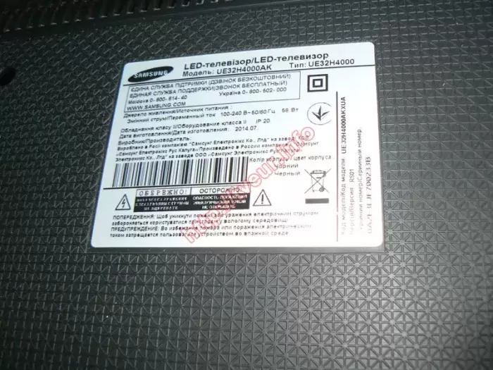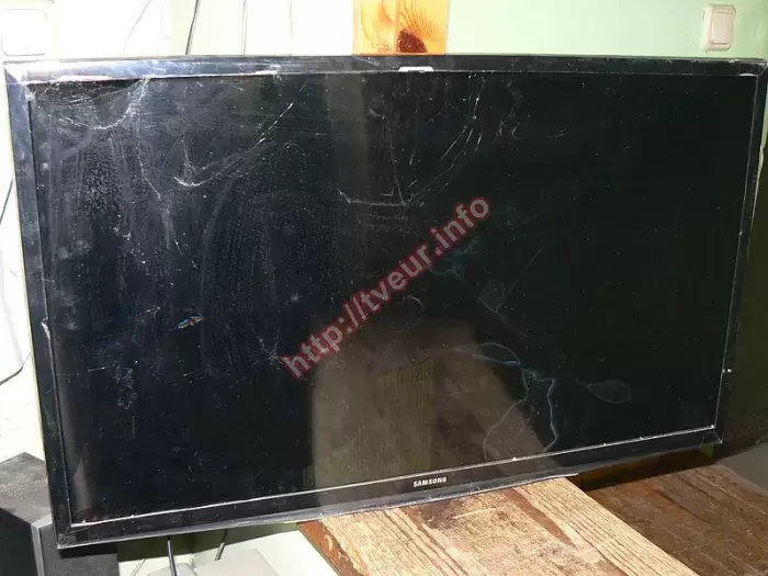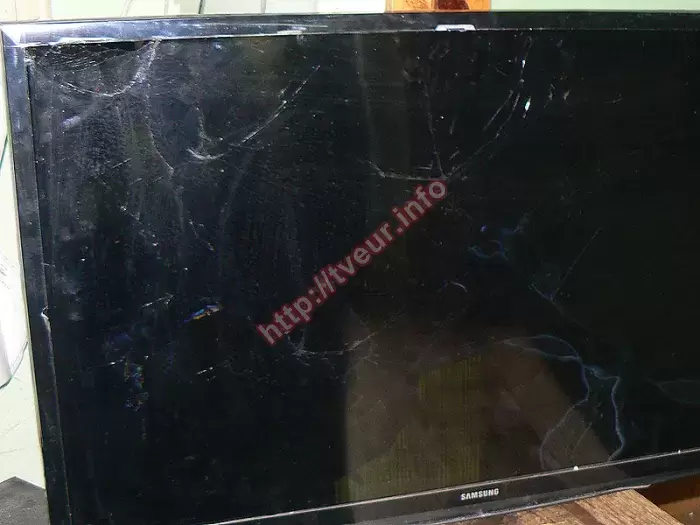 В 32-дюймовом телевизоре с LED подсветкой Samsung UE32H4000AK, который собран в 2014 году, очень сильно поврежден не только экран, но и левая боковая рамка, на ней выбоина. Это случилось в результате падения со стены. По этой причине заказчик прислал телевизор из пгт. Михайловка (Запорожская обл), упакованным в «родную» коробку в наш сервисный центр, который нашел, благодаря интернету. В данном случае возможна только замена ЖК экрана телевизора Самсунг, поскольку разбитая матрица восстановлению не подлежит. По телефону заказчик сообщил, что когда телевизор был только куплен, его установили на собственной подставке в нише мебели. Но после определенного времени такой эксплуатации выяснилось, что это неудобно, поскольку ТВ Самсунг занимал много места. Исходя из этого решили разместить его на стене. Всеми работами пользователь занимался самостоятельно, он прикрутил кронштейн на анкерные болты, которые видимо не выдержали нагрузки. Это стало известно после нескольких дней в таком положении, после чего телевизор упал вместе с кронштейном, причем экраном вниз. Как результат на нем огромное количество трещин, разной длины и глубины. Весь левый верхний угол в «сетке» из трещин. По всей панели видны светящиеся пятна с голубой окантовкой. Практически вся ЖК матрица залита четным цветом. В данном случае замена ЖК экрана телевизора Самсунг выполнялась после того, как нам удалось заказать и купить подходящую деталь. Только тогда была демонтирована разбитая панель и выполнена замена. Поскольку из-за падения сильно продавленными оказались светофильтр с рассеятелем, их также пришлось поменять. На данный ремонт + новую деталь заказчику выдали гарантию.