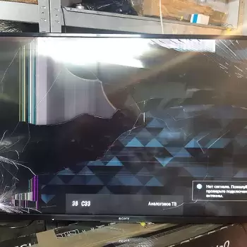 Телевизор Sony KDL-32WD603, поступивший в нашу мастерскую, имел серьезное повреждение, вызванное механическим воздействием. По словам владельца, по экрану был нанесен удар каким-то предметом, после чего изображение полностью пропало, а на дисплее остались множественные видимые дефекты: трещины, затемнения и вертикальные разноцветные полосы. Клиент также сообщил, что ранее устройство в ремонт не сдавалось, а все заводские пломбы и крепления остались в оригинальном состоянии. Это позволило сделать вывод, что внутренняя часть телевизора не подвергалась постороннему вмешательству.
