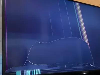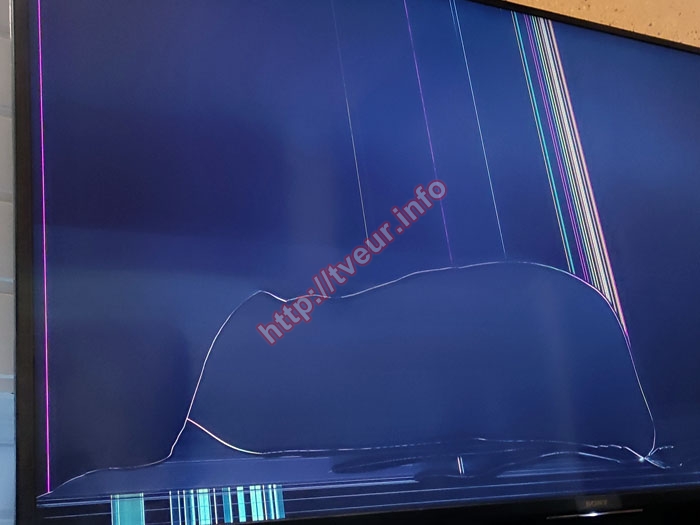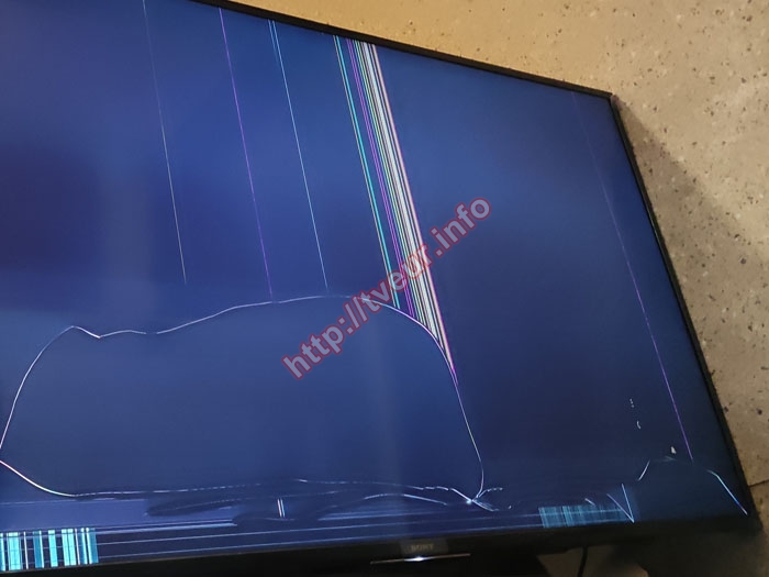 На экране возникли серьезные механические дефекты: несколько трещин тянутся по поверхности, одна из которых достигает нижнего левого угла. От главной трещины вверх распространяются вертикальные разноцветные полосы, особенно заметные с правой стороны. Вдоль левой рамки проходит ярко-фиолетовая линия, свидетельствующая о разрушении пиксельной структуры по всей высоте панели. В нижней части экрана, рядом с рамкой, видны серые пятна, характерные для расслоения слоев матрицы в месте удара. С обеих сторон экрана зафиксированы короткие светлые вертикальные полосы, что подтверждает повреждение подложки. Изображение полностью отсутствует, телевизор не способен корректно воспроизводить картинку. При детальном осмотре обнаружена щель между экраном и задней крышкой, при этом крепежные элементы корпуса остаются неповрежденными, что указывает на внутреннее разрушение панели, а не на дефект сборки. С учетом характера повреждений и невозможности восстановления отдельных компонентов требуется полная замена матрицы на телевизоре Sony.