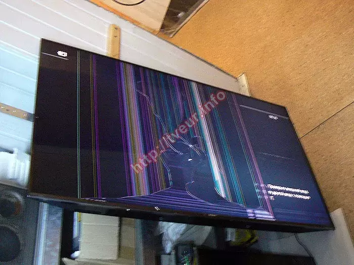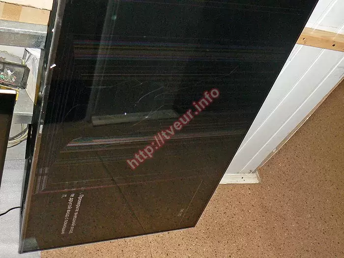 Первоначальный осмотр показал, что удар был посередине экрана, где появилась небольшая дырка. Здесь же в разные стороны пошли трещины разной длины, между которыми много цветных линий с разной толщиной. Вдоль нижней рамки синие горизонтальные полосы, чуть правее логотипа они белого цвета. Фрагменты горизонтальных линий также видны вверху. Справа светится часть заставки. Появление таких изъянов на матрице говорит о том, что единственным выходом в данной ситуации является замена экрана на телевизоре. Чтобы точно узнать, не пострадали ли пр ударе внутренние составляющие телевизора, была проведена диагностика. Она показала, что неисправна только матрица.