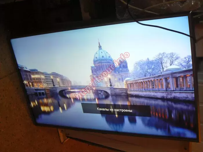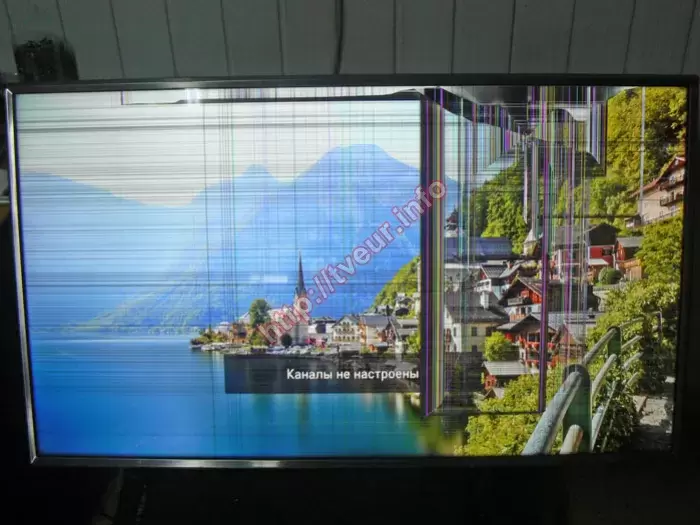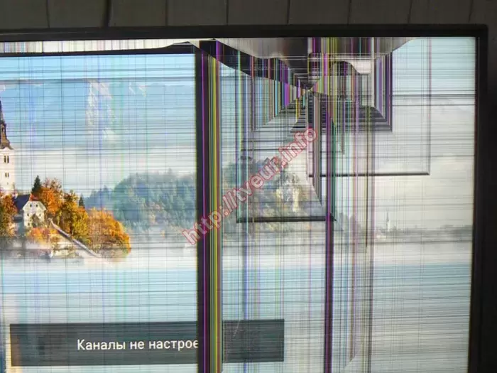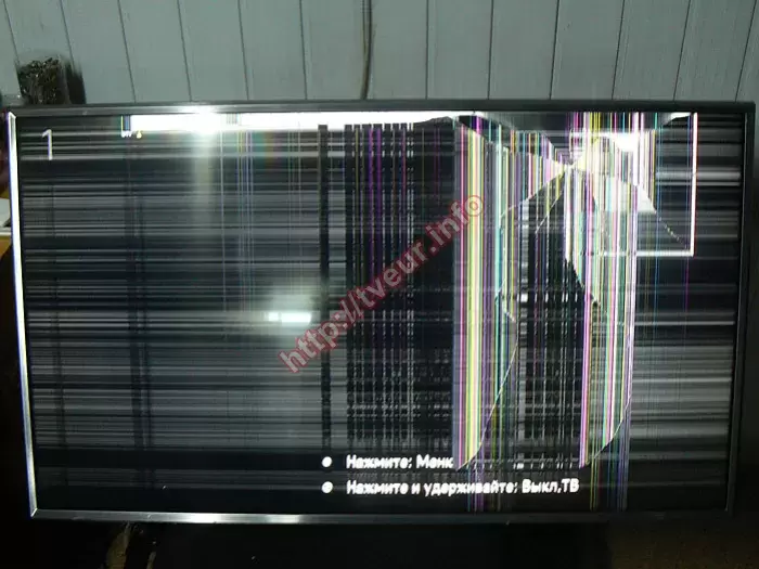 Такой ремонт, как замена матрицы телевизоров относится к разряду сложных, при этом, благодаря большому опыту он выполняется в нашей мастерской на высоком профессиональном уровне. Как оказалось телевизор включается, изображение присутствует, при этом на матрице множество повреждений. Удар был с правой стороны поблизости верхней рамки, здесь видна небольшого размера дырка, от которой трещины во все стороны. Практически вдоль всей верхней рамки появилась трещина, над которой пятно. Практически весь экран в горизонтальных и вертикальных полосах разной длины и ширины. Внизу осталась видна часть заставки. В первую очередь была выполнена диагностика, с помощью которой удалось установить, что из-за удара из строя вышла только матрица, остальные компоненты телевизора не пострадали.