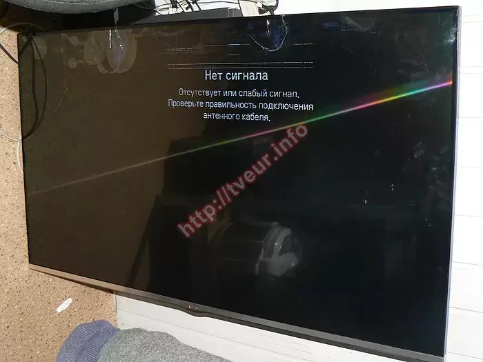 Поскольку мы всегда можем заменить матрицу на телевизоре LG, он принят в работу. Первоначальный осмотр показала, что из-за падения на пол матрица полностью вышла из строя, на ней разные механические повреждения, которые в основном сосредоточены около верхней рамки. На матрице появился светящийся скол, вокруг которого много мелких трещин. Левее еще один скол меньшего размера возле которого также мелкие трещины. Здесь же серые пятна, вероятнее всего в этих местах произошло отслоение матрицы. Посередине еле просматривается растровое пятно и горизонтальные линии белого цвета. На экране осталась светиться заставка «Нет сигнала. Отсутствует или слабый сигнал. Проверьте правильность подключения антенного кабеля». Выполненная диагностика показала, что при падении корпус и рамка телевизора остались целыми, внутренние составляющие полностью в рабочем состоянии. Исходя из этого требуется только лишь заменить ЖК матрицу на телевизоре LG.