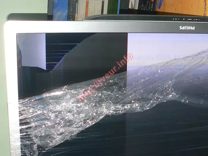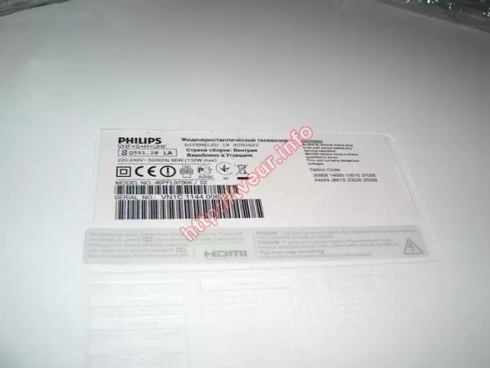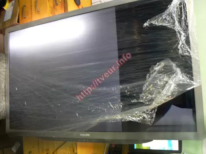 В жидкокристаллическом 3D телевизоре Philips 46PFL9706T по неосторожности разбит большой 46-дюймовый LED экран. В данном случае ремонт будет не только сложным, но и дорогим, поскольку гарантированно потребуется заменить экран телевизора. Этот телевизор поступил в мастерскую завернутым в целлофан, в обрешетки и «родной» коробке из города Курахове. Данная модель телевизора собрана в Венгрии, об этом свидетельствует этикетка на задней панели (см. фото № 3), которая хорошо читаемая. Устройство наделено такими современными технологиями, как Smart TV и Wi-Fi, в нем применена подсветка Ambilight Spectra XL. Оно отличается хорошим набором разъемов и портов, в число которых входит четыре HDMI, композитный, SCART, два USB и другие. Для того, чтобы заменить экран телевизора имеются все основания, поскольку он очень сильно поврежден. Как оказалось дети во время игры бросили что-то в телевизор. После предварительного осмотра телемастер выяснил, что в телевизоре разбит нижний правый угол, в этом месте видны трещины. Непосредственно сам угол белого цвета, вокруг получившегося пятна образовались разноцветные полосы, причем как вертикальные, так и горизонтальные. В этом месте экран залит черным цветом. Визуально, матрица разделена на две половины, правая ее сторона темно серого цвета, здесь просматриваются полосы, левая более светлая. Прежде чем выполнить замену новой панели, ее необходимо было заказать и купить. Это получилось не сразу, так как полученная матрица оказалась не той версии, соответственно ее пришлось заказывать заново. Только потом была снята разбитая деталь и установлена новая. После произведенных настроек изображение отличного качества. Заказчик получил гарантию, как на ремонт, так и на новую панель.