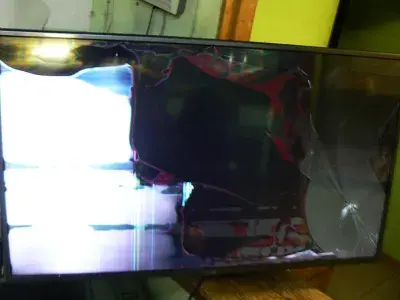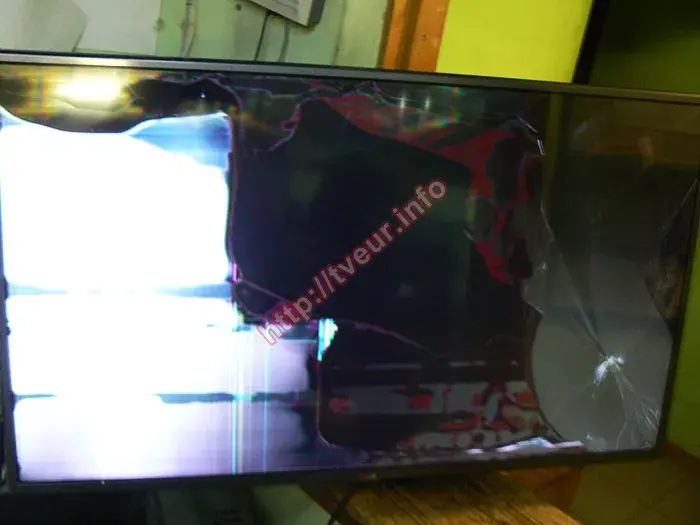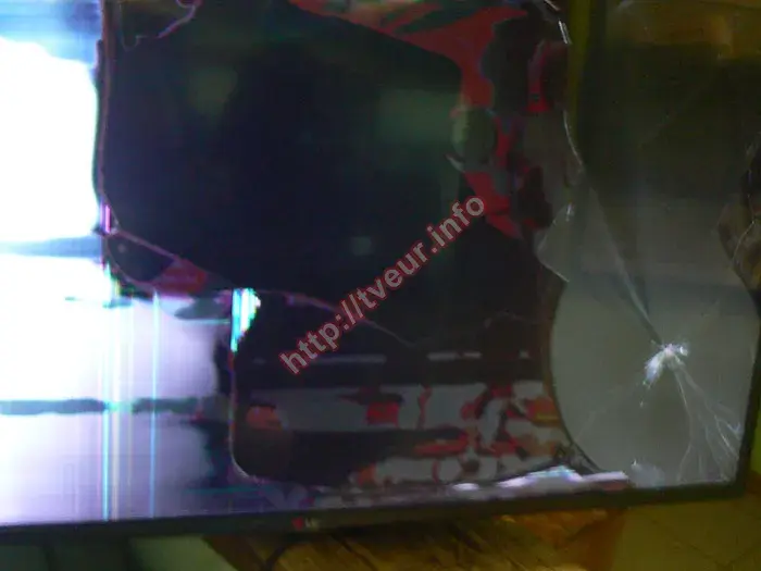 При первинному огляді сервіс менеджер зразу відмітив, що в цьому випадку єдиний вихід - замінити матрицю на телевізорі, оскільки вона не підлягає відновленню. Низу з правої сторони великий скол, що світиться, від якого численні тонкі тріщини у різні боки. Ще багато довгих тріщин по всьому екрану. Уся ліва сторона білого кольору, тут також проглядаються плями світло синього кольору та вертикальні смуги. Середина матриці темна, біля до верхньої рамки темно червоні плями невизначеної форми. Навколо сколу утворилася велика кругла пляма сірого кольору, очевидно, що в цьому місці є відшарування матриці. Над логотипом LG та правіше тріщини та плями сіро-червоного кольору. Обговоривши з замовником всі нюанси, телевізор був прийнятий у роботу. Після його розбирання та проведеної діагностики майстер зробив висновок, що заміні підлягає лише розбитий екран, всі решта внутрішні модулі (блок живлення, материнська плата, плата T-con та інші) при падінні не постраждали.