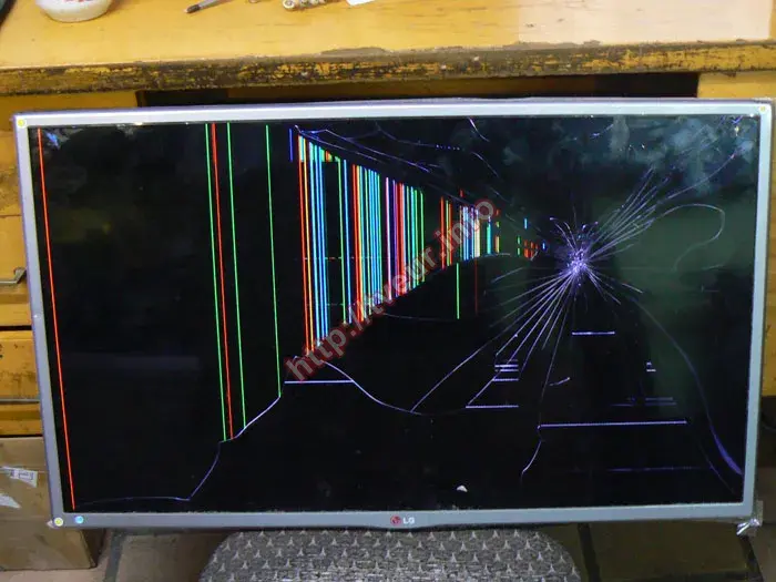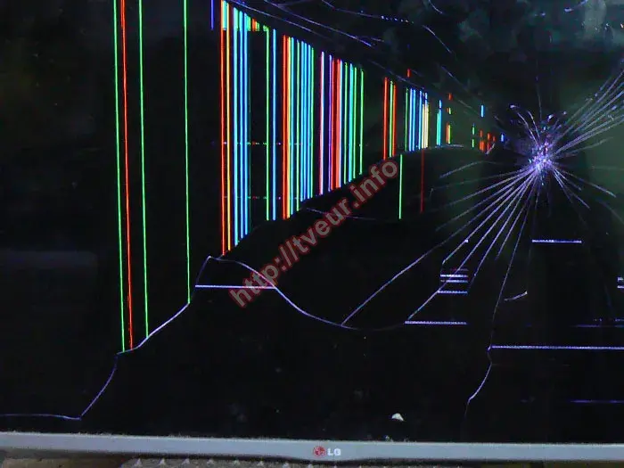 У нас великий досвід у виконанні таких ремонтів, як заміна матриці 32 дюйма, тож взялися за його виконання. Початковий огляд показав, що при ударі найшвидше з ладу вийшла тільки матриця, але стверджувати про це можна буде тільки після проведеної діагностики. У сервісному центрі телевізор увімкнувся, однак зображення не було. На екрані безліч різних механічних пошкоджень. З правого боку приблизно посередині великий скол, що світиться. Від нього в усі боки багаточисельні тріщини різної довжини. Кілька тріщин доволі довгих, які пройшли через увесь екран. З лівої сторони між тріщинами багато кольорових вертикальних смуг різної довжини, вздовж лівої бічної рамки вертикальна смуга яскраво-червоного кольору. В верхньому кутку невелика пляма синього кольору. Також внизу багато горизонтальних смуг, які з'явилися між тріщинами. Решта матриці чорного кольору, зображення відсутнє. Виконана діагностика показала, що заміні підлягає лише розбита матриця, решта внутрішніх складових телевізора (блок живлення, основна плата, плата T-con, підсвітка, шлейфи) в робочому стані, вони при падінні не постраждали. З результатами діагностики та орієнтовною ціною ремонта ми ознайомили замовника, який дав згоду на його виконання.