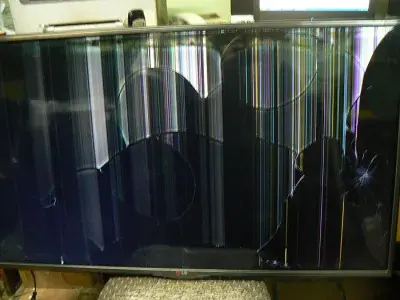 При первинному огляді телевізора стало очевидно, що пошкодження матриці серйозне. З правого боку дисплея виявлено дірку невеликого розміру, від якої розходяться численні короткі тріщини. Крім того, по всій поверхні екрана спостерігаються кілька великих тріщин. Від середини екрану та вгору помітні різнокольорові вертикальні смуги, а біля правого верхнього кута розташована велика світла пляма з фіолетовим відтінком. Подібна світла пляма також присутня біля верхньої рамки по центру матриці. Решта дисплея повністю чорна, зображення відсутнє. Очевидно, що у цій ситуації єдиним ефективним рішенням є заміна РК екрана телевізора, оскільки пошкоджена саме рідкокристалічна панель, а інші компоненти залишилися працездатними. Для проведення детальної діагностики телевізор був розібраний, а саме, знято задню кришку. Під час огляду підтвердилося, що удар пошкодив лише матрицю; плата живлення, підсвітка та інші електронні елементи залишилися в нормальному робочому стані. Це дозволяє виконати ремонт без заміни додаткових компонентів, зосередившись виключно на відновленні екрану.