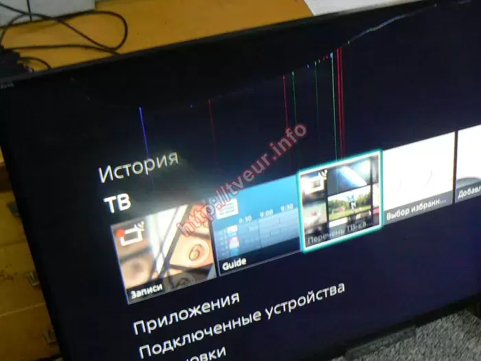 Унаслідок механічного впливу по матриці телевізора утворилася тонка, однак довга тріщина, яка простягається вздовж усієї верхньої частини рамки. Від зони пошкодження вниз по матриці багато кольорових вертикальних пунктирних ліній, що свідчить про внутрішнє руйнування матриці. Однак інших механічних дефектів корпусу чи екрана майстер не виявив. При вмиканні зображення на екрані частково збереглося, хоча воно з істотними спотвореннями. Оскільки в нашій сервісній майстерні надається така послуга, як заміна матриці телевізорів, пристрій прийнятий у роботу для проведення повної технічної діагностики. Для цього його довелося повністю розібрати, що дало змогу отримати доступ до внутрішніх модулів та електронних плат. Під час огляду виявлено стороннє втручання, а саме, на платі в кількох місцях були припаяні додаткові дроти, які не передбачені заводською конструкцією. Ймовірно, такі зміни були зроблені під час попередньої спроби відновлення чи адаптації несумісної панелі, що тепер потребує окремої оцінки перед тим, як виконувати ремонт.