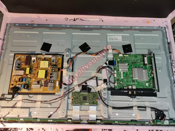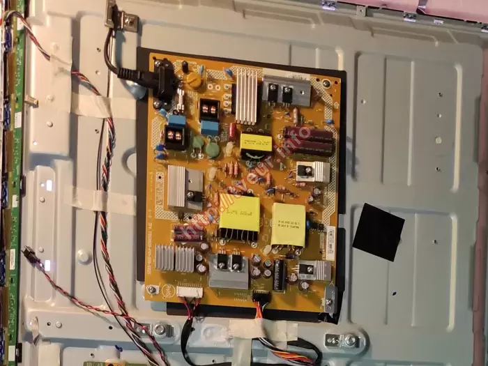 У сервісному центрі телевізор не реагував на увімкнення, а індикатор режиму очікування залишався вимкненим. Щоб встановити точну причину несправності та визначити оптимальний метод відновлення, була проведена детальна діагностика для телевізора. Для доступу до внутрішніх модулів майстер акуратно демонтував задню кришку корпусу, дотримуючись всіх заходів безпеки та акуратності. Після розкриття з’ясувалося, що в конструкції цієї моделі застосовуються блок живлення TPV 715G8620-P01-000-002S та материнська плата 715G8579-M01-B00-005Y. Діагностика проводилася поетапно, з перевіркою всіх ключових вузлів: материнської плати, інверторного блоку, систем живлення та з’єднувальних кіл. Вимірювання показали, що на виходах блока живлення відсутні стабілізовані напруги, що однозначно вказує на його несправність. Крім того, були виявлені декілька пробитих діодів, здуті електролітичні конденсатори та пошкодження одного з ключових транзисторів, відповідального за запуск та перетворення вхідної напруги. Попри значну кількість несправних компонентів, було встановлено, що блок живлення не потребує повної заміни. Його можна відновити на компонентному рівні, замінивши пошкоджені радіодеталі. Такий підхід дозволяє зберегти оригінальні частини телевізора, скоротити витрати на ремонт та зберегти заводську архітектуру пристрою, гарантуючи при цьому повну працездатність після відновлення.