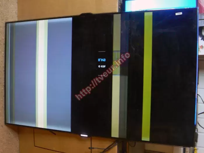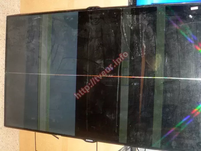 Коли телевізор увімкнули в сервісній майстерні то побачили, що на матриці багато перпендикулярних смуг та стовпів по зображенню, також слабо, але проглядаються горизонтальні смуги. Вздовж бічної лівої рамки тонка смуга білого кольору, правіше блідо зелена смуга, ще правіше з'явилася широка вертикальна біла смуга. Далі матриця чорного кольору, посередині світиться частина заставки, потім вертикальна двоколірна смуга, а правіше яскраво зеленого кольору. Мало того, дефект проявляється у вигляді горизонтальних смуг, хоча не так сильно виражених. Зовнішній стан телевізора задовільний, на екрані пил, бруд та потьокі. Той факт, що в цій ситуації знадобиться ремонт матриці телевізора Самсунг сумнівів не викликає, однак наскільки він буде складним покаже діагностика. Телевізор розібрали, виконали поглиблену діагностику та з'ясували, що з ладу вийшли драйвери планок матриці. Оскільки їх не можливо відновити, відповідно потрібна їх заміна, на що замовник дав свою згоду.
