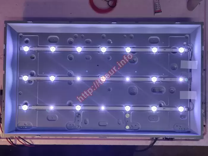 Першим етапом було повне розбирання телевізора, що дало змогу детально оцінити його внутрішній стан та ідентифікувати елементи, які застосовуються в цій моделі. Після демонтажу стало відомо, що у цій моделі використовується мікросхема BD9483F. Підсвітка реалізована у вигляді трьох окремих планок, кожна з яких містить сім світлодіодів. Під час огляду вдалося з’ясувати причину стороннього звуку, який власник чув при перевертанні телевізора: декілька лінз LED-елементів відпали через перегрівання та втрату фіксації. Таке явище доволі поширене у телевізорах із тривалим часом роботи, коли температура всередині корпусу значно підвищується. Проведена діагностика підтвердила, що ремонт підсвітки в РК телевізорі у цьому випадку є неминучим. Виявлено, що частково вийшов з ладу так званий «ліхтар» матриці - елемент, який відповідає за рівномірний розподіл світла. Окрім цього, потрібне пропаювання блоку живлення для відновлення стабільної подачі струму на світлодіодні планки. Також згідно з результатами перевірки необхідно замінити п’ять несправних світлодіодів, які більше не видають достатнього світлового потоку. Комплекс цих робіт дозволяє повністю відновити яскравість та рівномірність підсвітки, забезпечуючи правильну роботу матриці та повертаючи телевізору його початкові світлотехнічні характеристики.