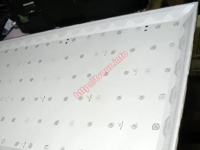 Під час первинного огляду фахівці виявили на екрані телевізора характерні світлі засвіти, що проявляються у формі нерівномірних плям на однотонному тлі. Для уточнення причин телевізор було розібрано, після чого встановлено, що в моделі використовується система підсвітки DUGE-500DCB-R3 (14.03.17). Під час детальної діагностики техніки з’ясували, що майже на кожній LED планці є одразу кілька перегорілих світлодіодів, тобто підсвітка має масовий знос. Крім того, пошкоджено один із ключових елементів конструкції, так званий ліхтар матриці (світлорозсіювальний елемент), який забезпечує рівномірний розподіл світла по всій площі екрана. Його вихід з ладу додатково погіршує якість зображення, спричиняючи засвіти та затемнення. За таких умов відновлення всієї системи шляхом поштучної заміни світлодіодів є неефективним: замінювати велику кількість елементів технологічно складно, довго, а результат не гарантує тривалого терміну служби. Тому найбільш доцільним рішенням у цьому випадку є повна заміна комплекту LED планок.