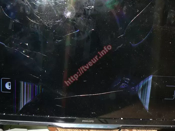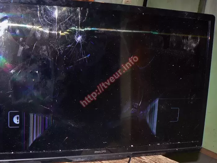В сервисный центр из города Вознесенск Николаевской области поступил 32-дюймовый LED телевизор Philips 32PFL4308T/12, у которого после падения очень сильно разбита матрица. Телевизор был упакован в коробку от производителя, которая очень сильно помята и без пенопласта (см. фото № 4). В коробке также был шнур и крепление на стену. Заказчик попросил купить матрицу для телевизора Филипс 32-дюйма с последующей заменой. По телефону он сообщил, что телевизор сорвался со стены и упал экраном вниз на пол. Когда его подняли на матрице не было живого места, она практически вся в различного рода повреждениях. Мы можем купить новую панель Филипс и поменять на телевизоре. Данная модель собранная в Польше в 2013 году, с поддержкой 3D, у нее два разъема HDMI на задней панели и еще один - на боковой. Осмотрев телевизор стало понятно, что возле верхней рамки образовались два пятна из мелких трещин, одно чуть больше, другое немного меньше. Здесь же сколы от сильного удара. Практически весь экран в тонких трещинах и царапинах разной длины. Внизу, по обе стороны от логотипа Philips между трещинами образовались вертикальные разноцветные полосы. По краям видны части заставки. Остальная часть экрана черного цвета. Мы смогли купить матрицу для телевизора Филипс 32-дюйма и выполнить качественную, результативную замену. После окончания ремонта и выполненных настроек телевизор был отправлен заказчику в нормальной коробке с пенопластом, формованным под данную модель. Выдана гарантия.