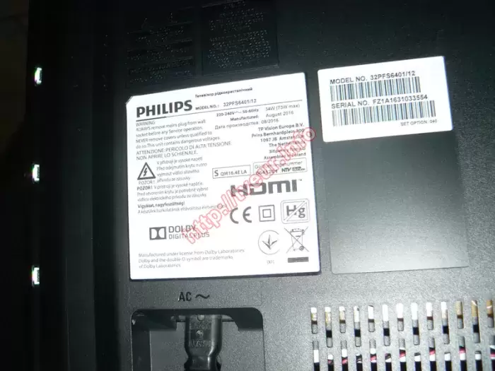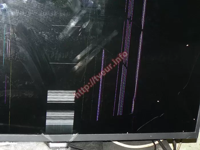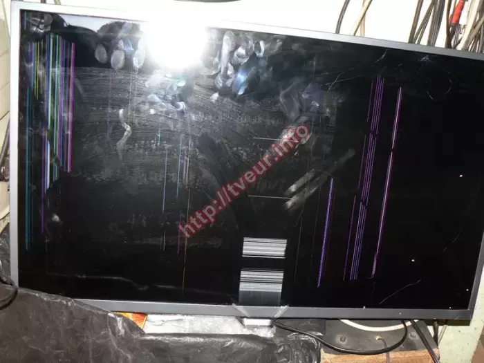 В сервисную мастерскую доставлен 32-дюймовый LED телевизор с функцией Smart TV (Операционная Система Android 4) Philips 32PFS6401/12, у которого достаточно сильно механически повреждена матрица. Заказчик попросил, чтобы замена матрицы на телевизоре Philips была выполнена в самые короткие сроки. Данная модель, которая относится к линейке 2016 года (страна изготовитель Польша), ранее не вскрывалась и не ремонтировалась. Со слов пользователя телемастер узнал, что с того момента, как приобрели этот телевизор, он был установлен на специальной тумбочке и так работал все это время. Придя с работы, он услышал сильный грохот в комнате, как оказалось, это телевизор рухнул экраном вниз на пол. Осмотрев его, пользователь сделал заключение, что отломились крепежи подставки, не выдержав нагрузки. Проблема усложнилась еще и тем, что на тот момент на полу лежали разные предметы, в том числе детские игрушки. Телевизор упал на них, вследствие чего экран недопустимо сильно поврежден. На нем образовались сколы, причем сразу в двух местах, недалеко от верхней рамки, а также посередине слева. От этих мест много трещин разной длины и глубины. На экране много белых светящихся точек, которые сконцентрированы в правом нижнем углу (см. фото № 2). По всему экрану вертикальные цветные столбцы, особенно их много возле левой боковой рамки. Над логотипом Philips образовалась широкая растровая полоса белого цвета (видно на фото № 1 и 2). В данном случае замена матрицы на телевизоре Philips выполнялась после того, как удалось купить подходящую деталь. Только тогда демонтировали разбитую и на ее место установили новую. На замену и панель пользователю выдана гарантия. После всех настроек телевизор с отличным качеством изображения.