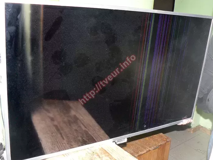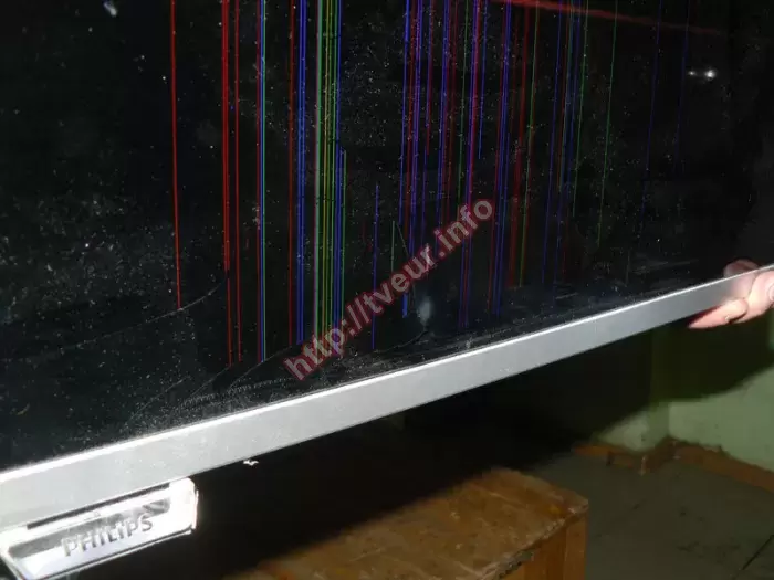 3D телевизор Philips 40PFT6510/12 поступил с очень сильно поврежденной 40-дюймовой матрицей, на ней многочисленные трещины, полосы и другие изъяны. Требуется срочная замена матрицы Philips, которую необходимо заказать и купить. Данный телевизор, который собран в Польше в 2015 году, наделен такими популярными функциями, как Smart TV (Операционная Система Android TV) и Wi-Fi. Благодаря уникальной технологии Philips Ambilight визуально расширяются границы экрана, усиливая впечатления от просмотра посредством проекции светового ореола, которые по двум сторонам от экрана. Данная технология призвана увеличивать яркость красок, давая возможность зрителю полностью погружаться в происходящее на экране. При осмотре телевизора стало понятно, что замена матрицы Philips неизбежна, так как на ней внизу правее логотипа большая светящаяся дырка, от которой по всему экрану трещины разной длины. Некоторые из них со светящимся эффектом. Вверх от трещин пошли многочисленные вертикальные разноцветные линии (хорошо видно на фото № 2 и 3). Сама матрица очень сильно запылена. При падении рамка и остальная часть корпуса, которая белого цвета, не пострадала, на ней нет каких-либо механических повреждений. Нами заказана новая панель с учетом размера, модели и версии. По ее прибытию, демонтирована разбитая деталь, вместо нее установлена новая. После удачной замены, которая выполнялась с использованием специального оборудования, сделаны настройки. Заказчику выдана гарантия и даны рекомендации по дальнейшему использованию ТВ.