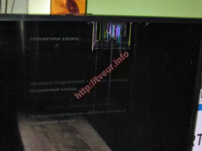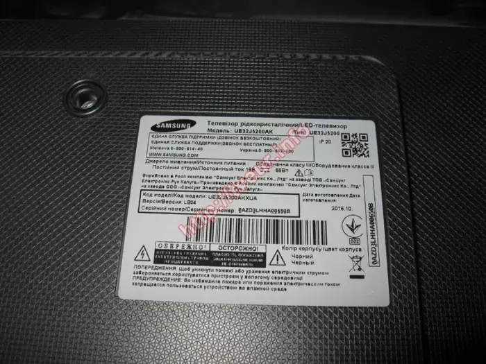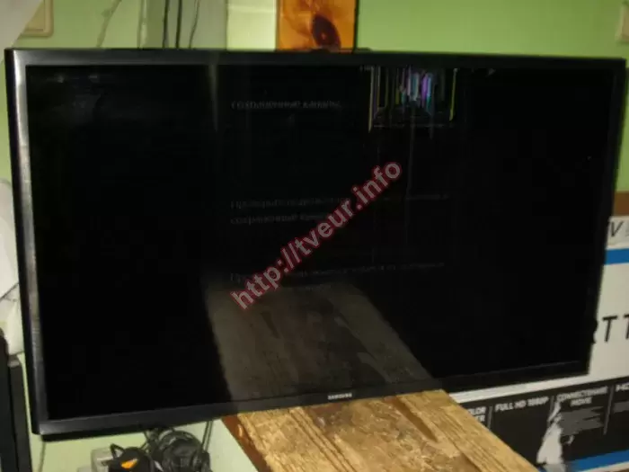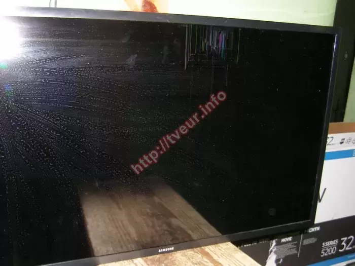 В 32" (81 см) телевизоре Samsung UE32J5200 AK с поддержкой функции Smart TV появились трещины, у него разбит экран, по которому сильно ударили. В результате требуется дорогостоящая замена матрицы телевизора, выполнить которую возможно только в сервисном центре. Данная модель с разрешением 1920x1080 точек, форматом экрана 16:9 и поддерживаемыми форматами MP3, WMA, MPEG4 и JPEG. К особенностям этого современного телевизора (год его выпуска 2016) следует отнести поддержку Wi-Fi и CI+. Как оказалось по экрану ударили, причем удар был недалеко от верхней рамки, ближе к правой стороне. В результате от места удара появились многочисленные тонкие трещины (достаточно короткие). Более того, между трещинами образовались разноцветные короткие вертикальные линии. Посередине экрана едва просматривается заставка, которая двоится. Весь экран при этом черного цвета. Наряду с такой сложной поломкой, матрицу помыли мокрой тряпкой. Это отлично видно на фото № 3, чего в принципе делать нельзя. Как итог, требуется дорогостоящая замена матрицы телевизора. Такой ремонт, как этот, относится к категории сложных, поскольку разбитый экран необходимо правильно демонтировать и только после этого с максимальной аккуратностью установить новый. После выполненной замены и последующих настроек, этот телевизор работает отлично. Беречь от ударов и падений, не протирать матрицу мокрой тряпкой!
