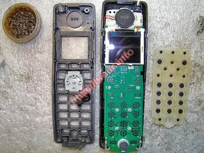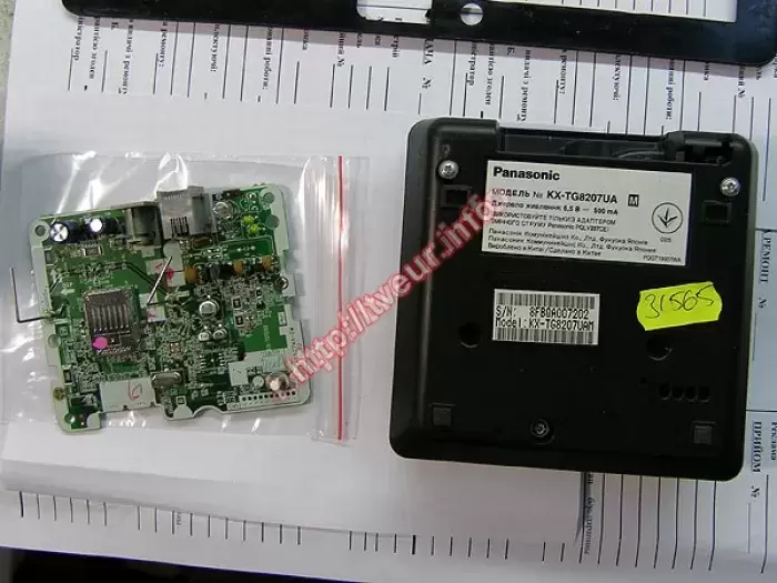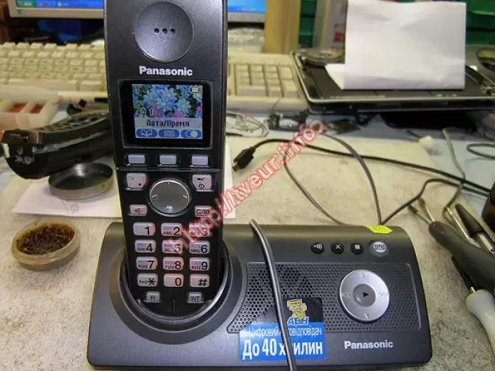 Цифровой беспроводной домашний телефон с автоответчиком Panasonic KX-TG7127UA перестал работать после того, как его залили жидкостью. Как результат, нет регистрации трубки на базовом блоке. Кроме того, видны следы жидкости в трубке и в базовом блоке. Пользователь попросил, чтобы ремонт радиотелефонов был сделан срочно. Данная модель с телефонным справочником на 50 номеров, повторным набором 5 номеров, а также индикатором входящего вызова. В данном случае из строя вышел блок BS/HS, поэтому ремонт состоял в его реставрации. Кроме того на станции восстановлен ВЧ-блок, удалены окислы с платы базы. Помимо этого, устранен обрыв в цепи 2,4В, сделана общая профилактика трубки. Заменены и перепаяны некоторые пассивные элементы. Теперь этот радиотелефон полностью рабочий. На будущее пользователю рекомендовано беречь устройство от залитий!