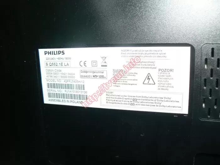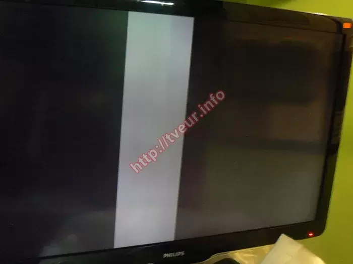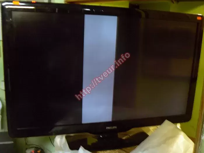 В 42-дюймовом ЖК (LCD) телевизоре Philips 42PFL5405H/12, который изготовлен в Польше появилась широкая серая вертикальная полоса в 20 см. Как объяснил заказчик, доставивший телевизор в сервисный центр, экран хотели помыть и по неосторожности во внутрь попала вода. Как показывает практика, с такой неисправностью возможен ремонт залитой матрицы телевизора, или ее замена, но для начала это должна подтвердить проведенная предварительная диагностика. Этот телевизор с технологией Pixel Plus 2 HD, благодаря которой достигается сочетание максимальной четкости, естественного изображения, живых цветов и плавного движения при стандартном ТВ сигнале. У телевизора отличные углы обзора 178° / 178°, яркость 500 кд/м², контрастность 100 000:1 и время отклика 2 мс. Ранее этот телевизор не вскрывался и не ремонтировался, он в достаточно хорошем состоянии. На задней стенке имеются все этикетки с информацией о модели. Осмотрев устройство стало понятно, что практически посередине матрицы появилась широкая вертикальная полоса серого цвета, отчетливо читающаяся на черном фоне (можно увидеть на фото № 1 и 2). Это свидетельствует о том, что ремонт залитой матрицы телевизора будет достаточно сложным. После разборки устройства были заменены некоторые компоненты матрицы. Такой сложности ремонт выполнялся с использованием специальной оснастки. В дальнейшем стараться экран не заливать!