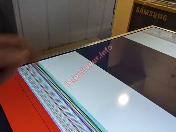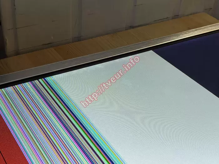 Включив телевизор мастеру стало понятно, что проблема с изображением носит выраженный характер. На экране отчетливо видны множественные вертикальные полосы, наиболее заметные в области слева от логотипа. В этой же зоне проявляется широкая красная линия, а также аналогичная полоса вдоль правого края экрана. Кроме того, сохраняется фрагмент исходного изображения. Подобные визуальные искажения, в частности, вертикальные полосы и частичное исчезновение картинки, в большинстве случаев свидетельствуют о сбоях в работе матрицы либо управляющих компонентов, отвечающих за ее функционирование. В ходе демонтажа и детальной диагностики подтвердилось первоначальное предположение: необходим ремонт матрицы телевизора, цена которого окажется значительной, так как требуется замена драйверов, встроенных непосредственно в структуру самой матрицы.
