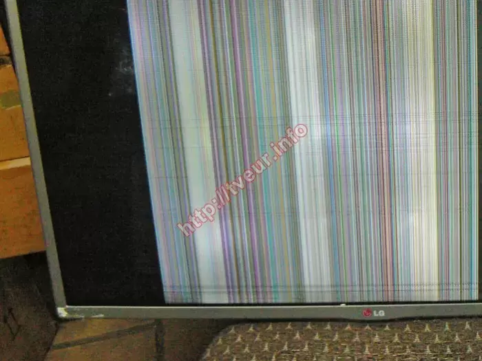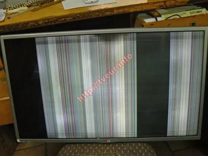 На экране телевизора вместо изображения многочисленные вертикальные цветные полосы с преобладанием белого цвета. В основном они сосредоточены вдоль правой боковой рамки (здесь их меньше) и по середине матрицы. Остальная часть экрана черного цвета. Кроме того, по матрице просматриваются горизонтальные тонкие линии. Прежде чем осуществлять ремонт полос на телевизоре, вне зависимости от его сложности, необходимо с высокой точностью определить первопричину неисправности. Для этого предусмотрена углубленная диагностика, в ходе которой было установлено, что он будет сложным, так как некоторые элементы матрицы вышли из строя и не подлежат восстановлению на компонентном уровне. В связи с этим для решения проблемы потребуется их замена, что, в свою очередь, повлияет на конечную стоимость ремонта. Заказчик был проинформирован о результатах диагностики и согласился на его выполнение с заменой неисправных драйверов.