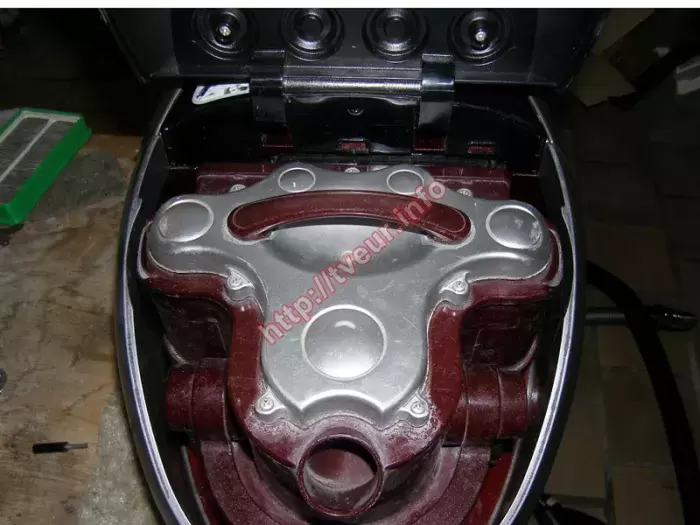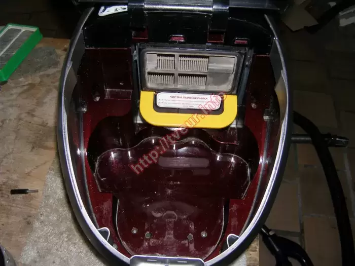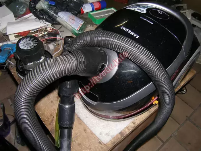 Пылесос без мешка с аквафильтром Samsung SD 9480 начал плохо работать, а именно, во время работы очень сильно тарахтеть, кроме того, появился запах горелого. Такие симптомы говорят о том, что возможно проблема в двигателе, поэтому ремонт пылесосов будет сложным и дорогим. В этой бытовой технике используется инновационная система фильтрации при помощи воды - Aqua Multi-cyclone, которая специально создана для максимального удаления в помещении аллергенов. Во время чистки создается мощный водяной, а также циклонный поток, создавая водяной вихрь. Потребляемая мощность пылесоса составляет 1600 Вт. Радиус действия устройства 10 метров, поворот шланга 360°. После предварительного осмотра стало понятно, что пылесос очень грязный и пыльный внутри, у него горят роторные катушки, шланг порван и замотан скотчем, корпус весь в царапинах. При этом главной проблемой является, вышедший из строя двигатель. Восстановить его работоспособность не предоставляется возможным. В данном случае ремонт пылесосов состоял в замене нового двигателя «AMETEК» A 061300555, который пришлось заказывать. Кроме того, полностью отреставрирован шланг, для чего использовался эпоксидный клей (видно на фото № 5). Такой ремонт обошелся заказчику не дешево, поэтому на будущее ему даны советы, как правильно эксплуатировать данную бытовую технику, а именно, периодически ухаживать.