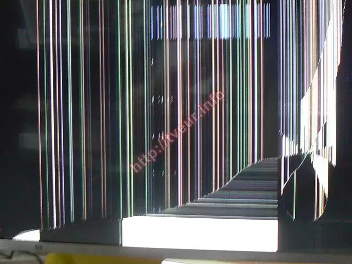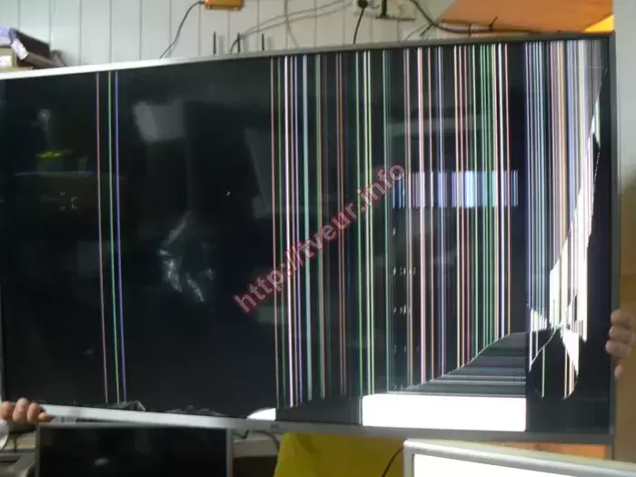 Мы всегда предоставляем такую услугу, как замена ЖК панели телевизора, поэтому приняли его в работу. Как оказалось удар был немного выше правого нижнего угла, в результате которого появилась небольшого размера дырочка. От нее в разные стороны пошли трещины, некоторые из них достаточно длинные, а одна вдоль всей нижней рамки. Между трещинами белые столбцы, возле нижней рамки продолговатое пятно белого цвета. От середины экрана и до правой рамки очень много цветных вертикальных полос. Под трещиной видно пятно, которое состоит из горизонтальных линий. Ближе к левой боковой рамке три вертикальные полосы синего, зеленого и фиолетового цвета. Выполненная диагностика показала, что все внутренние составляющие телевизора (платы, шлейфы и т.д.) полностью в рабочем состоянии, поэтому требуется только лишь замена разбитого экрана.