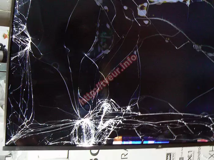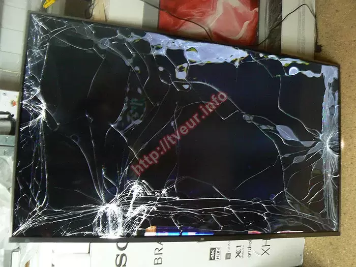 Мы всегда можем заменить матрицу на телевизоре, не зависимо от бренда или диагонали. Как оказалось, при падении экран пострадал очень сильно. Он весь в многочисленных трещинах, которые везде и они с разной длиной и глубиной. Особенно их много по краям матрицы, посередине их немного меньше. Возле нижней рамки (слева) образовалась «сетка» из трещин, также их очень много возле правой боковой рамки. Наряду с трещинами появились пятна серого цвета неопределенной формы, быстрее всего в данных местах расслоилась матрица, чем и вызван такой эффект. Остальной экран залит черным цветом, изображения нет, только возле нижней рамки просматривается небольшого размера продолговатое пятно, на котором разноцветные полосы. При падении также появились повреждения на рамке, что негативно отразилось на общий вид телевизора.