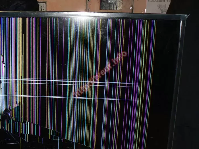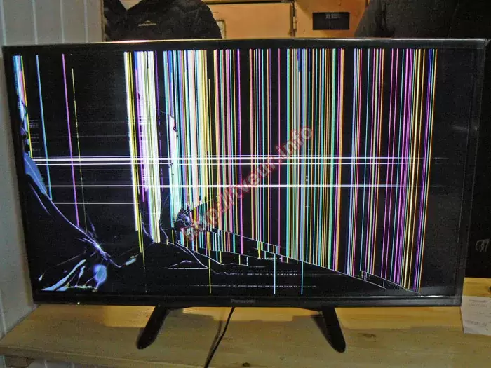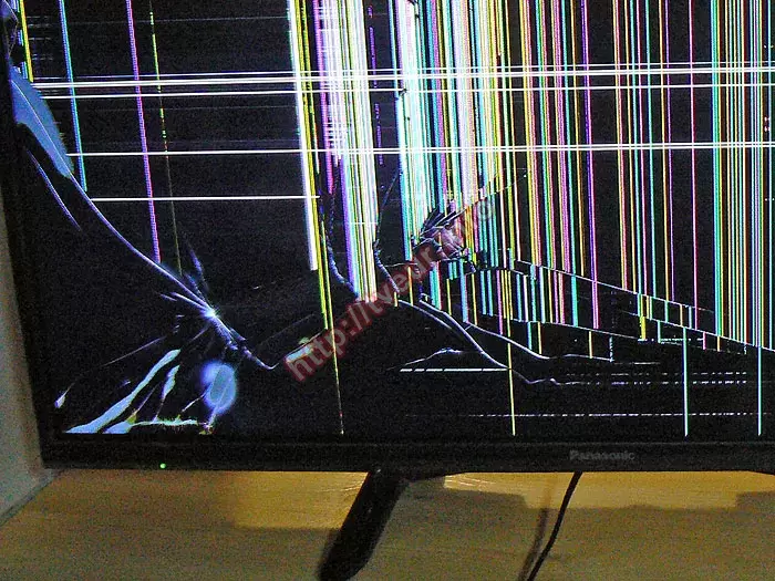 Из-за падения на пол матрица в телевизоре не пригодна к использованию, она полностью вышла из строя, поскольку покрыта многочисленными дефектами. На экране много трещин разной длины, в основном они находятся в нижней части. Середина экрана покрыта разноцветными вертикальными столбцами. Вдоль левой рамки также появились цветные полосы, а посередине белые горизонтальные линии. Не меньше при падении пострадала левая нижняя часть матрицы, на которой скол и серые пятна. Появление таких механических повреждений указывает на то, что замена матрицы телевизора в Киеве станет неизбежной.