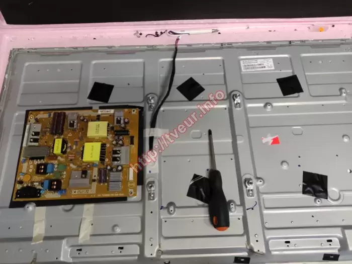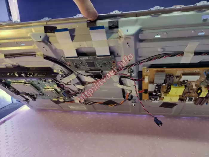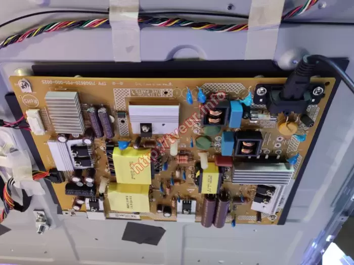 Внешне телевизор находится в отличном состоянии: корпус, рамка и экран без каких-либо механических повреждений, царапин или следов эксплуатации. Однако при попытке включения устройства в мастерской оно не подало никаких признаков жизни - отсутствует индикация питания, экран не запускается, реакции на пульт и кнопки управления нет. В рамках первичной проверки специалисты разобрали телевизор для определения модели внутренних компонентов. В устройстве установлен блок питания TPV 715G8620-P01-000-002S и системная (main) плата 715G8579-M01-B00-005Y. На следующем этапе была проведена диагностика телевизора, в ходе которой выяснилось, что модуль питания получил серьезные повреждения: обнаружены многочисленные сгоревшие элементы, включая силовые транзисторы, диоды и часть компонентов вторичной стабилизации напряжения. По всей видимости, блок питания подвергся перегрузке или скачку напряжения, в результате чего полностью утратил работоспособность, что привело к полной неработоспособности устройства. Дальнейшее восстановление возможно путем замены его компонентов, с обязательной проверкой исправности основной платы, чтобы исключить повреждение других узлов.